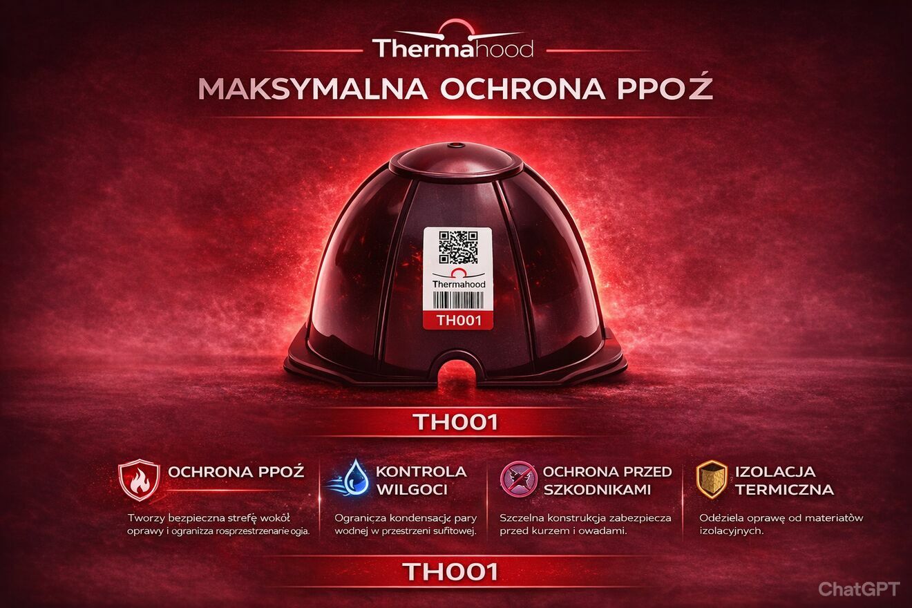 Thermahood – szczelna i bezpieczna osłona opraw halogenówThermahood to profesjonalna osłona montowana nad oprawą sufitową typu downlight, która: