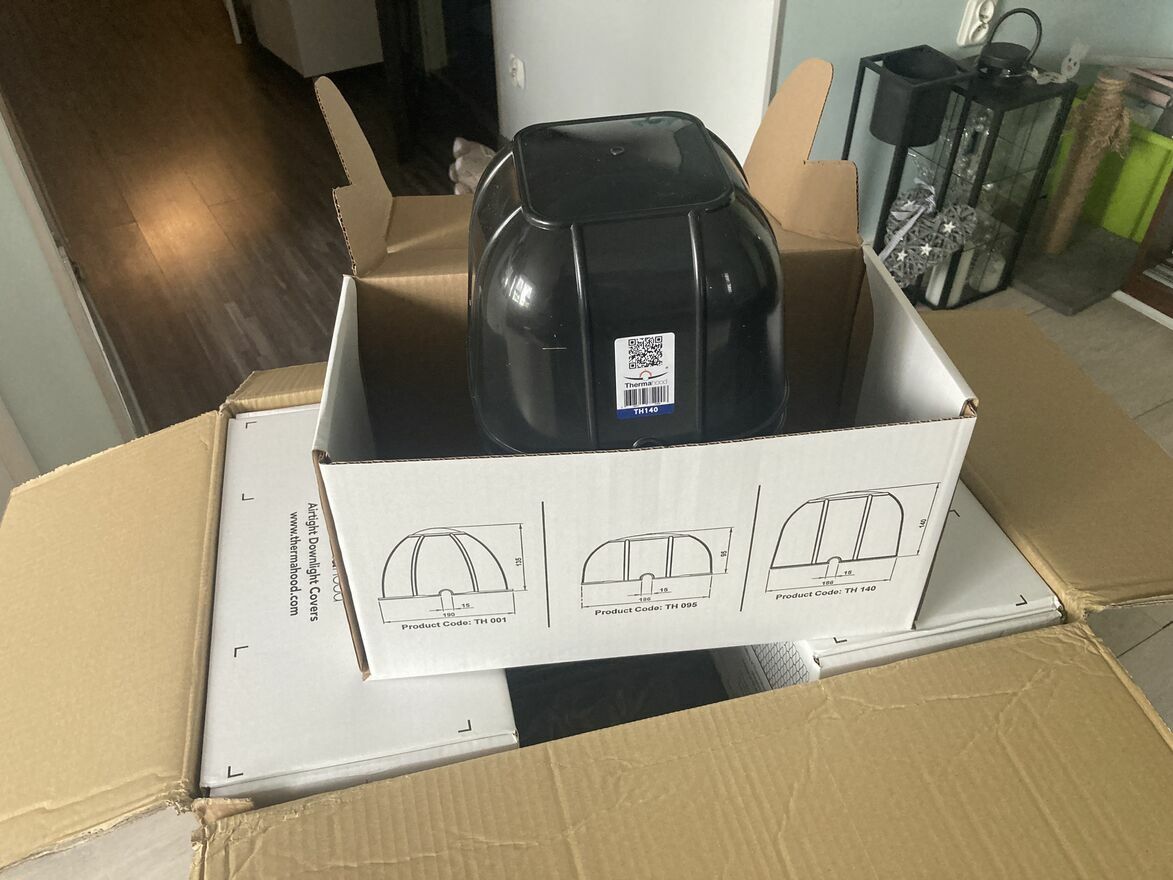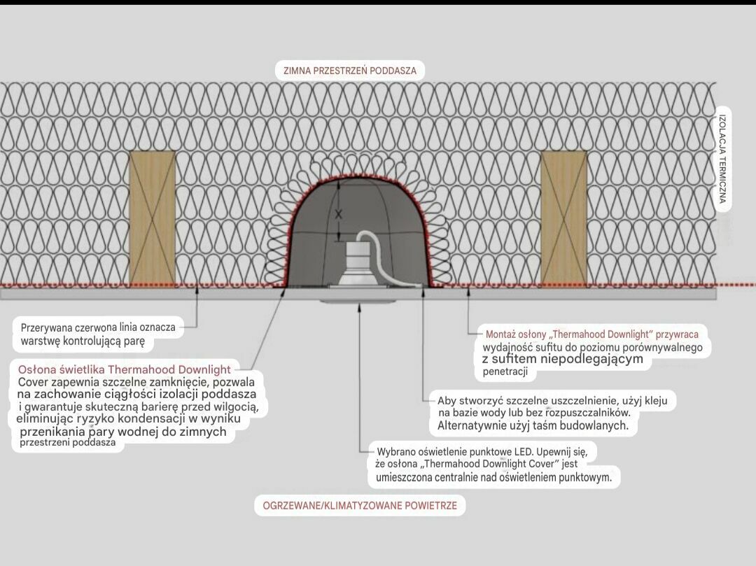 Thermahood to osłona montowana nad oprawą sufitową typu downlight. Jej zadaniem jest uszczelnienie przestrzeni wokół oprawy, ograniczenie ucieczki ciepła oraz umożliwienie bezpiecznego przykrycia jej izolacją poddasza.