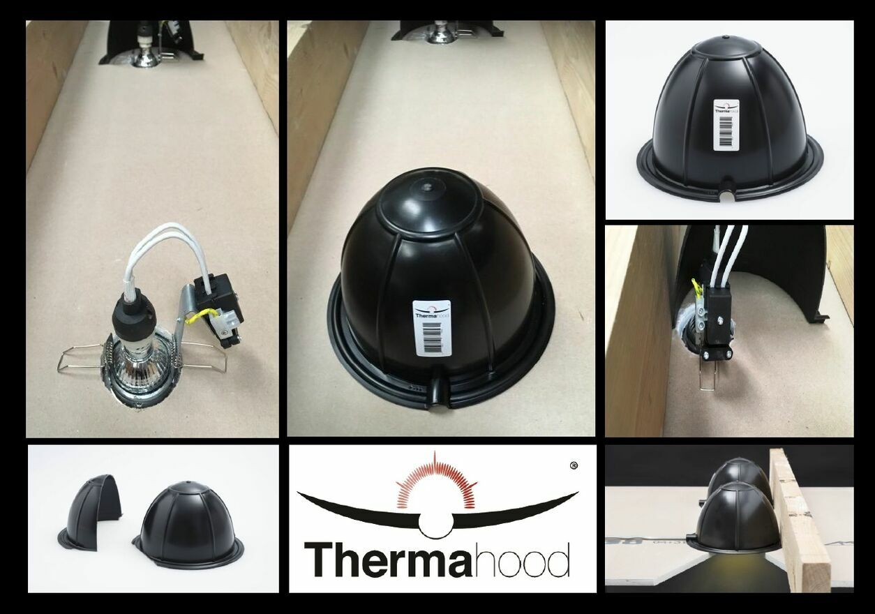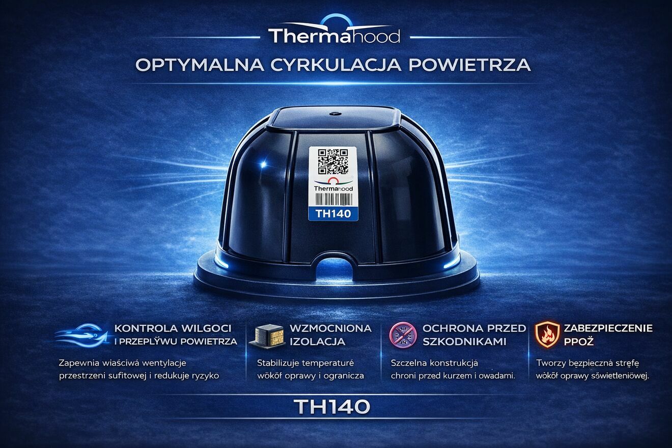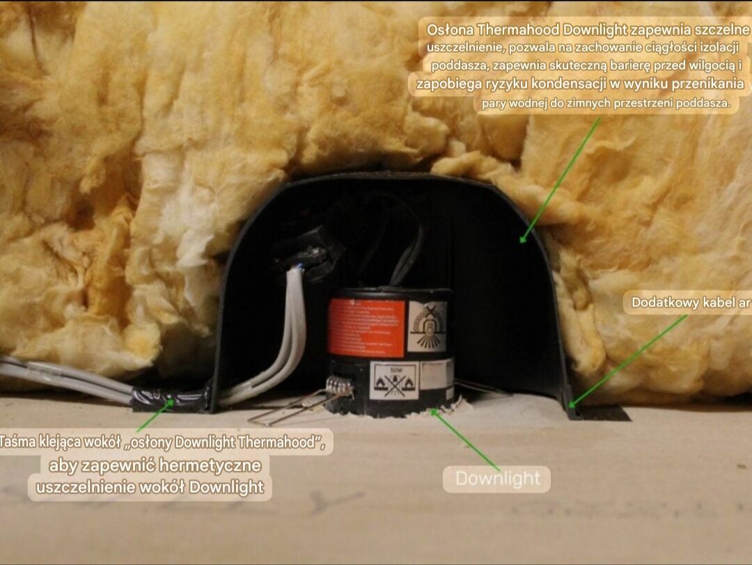Thermahood – szczelna i bezpieczna osłona opraw downlightThermahood to profesjonalna osłona montowana nad oprawą sufitową typu downlight, która: